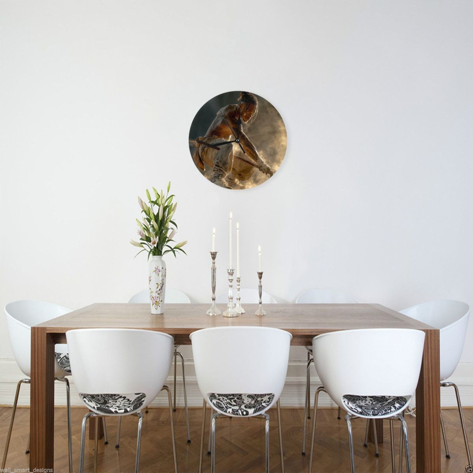 This round wall clock integrates the power of martial arts with artistic beauty, creating a unique visual focus for the space: